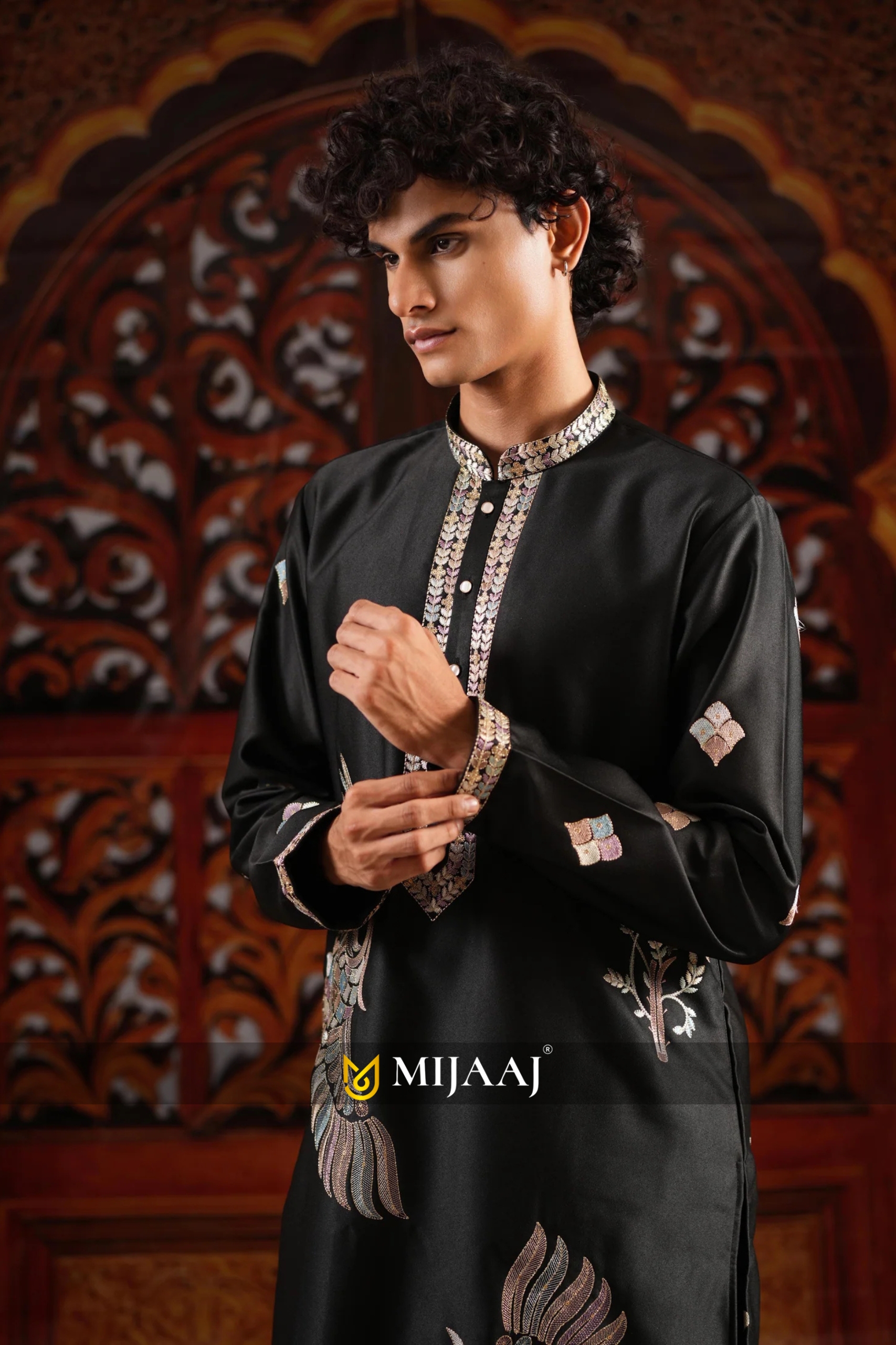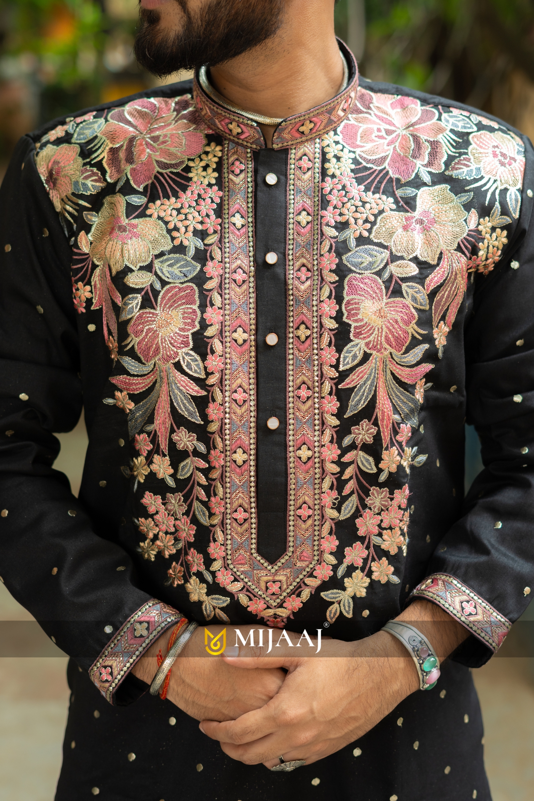Men’s Black Silk Foil & Multicolour Thread Work Embroidered Kurta Set