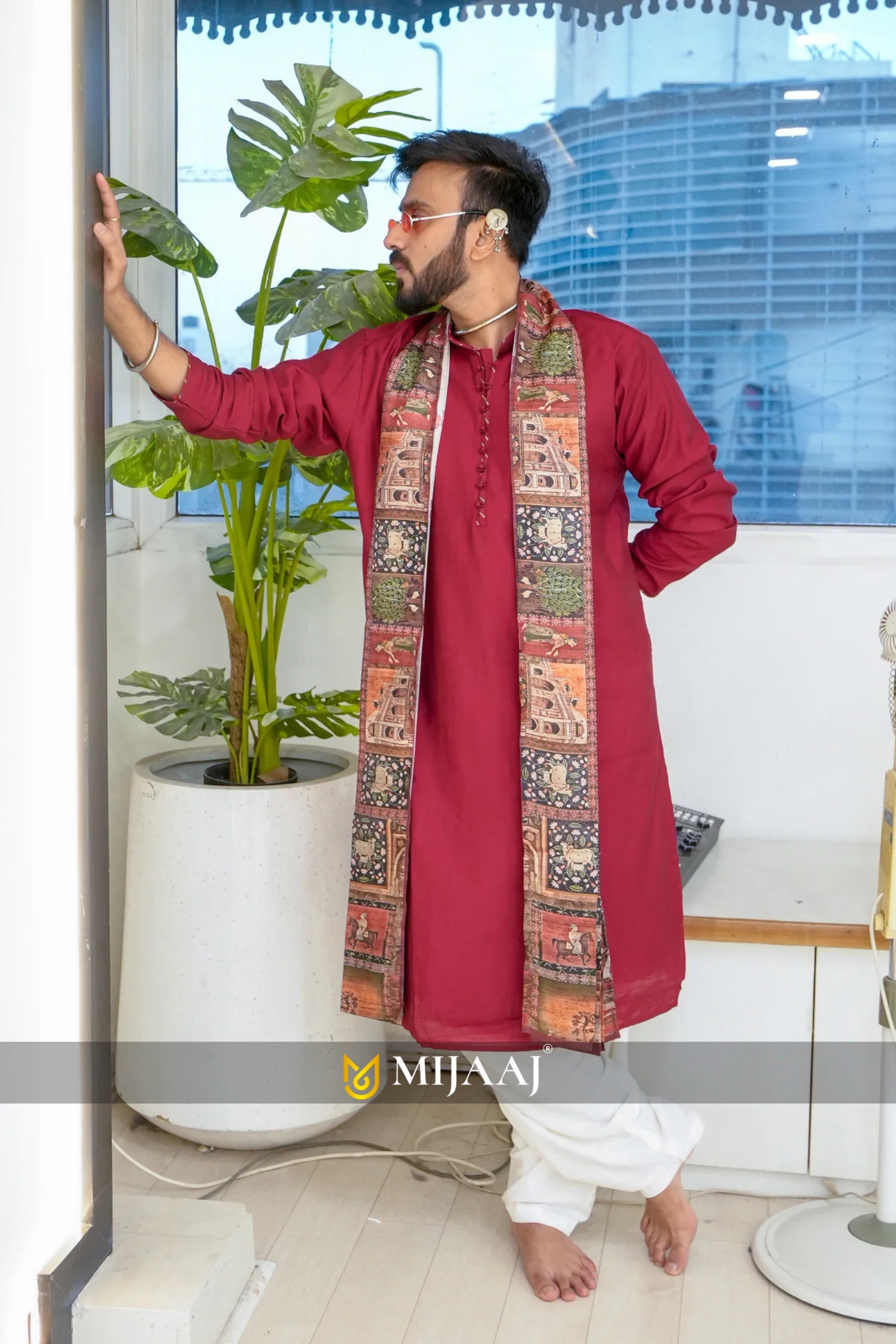 Men’s Maroon Sigma Silk Kurta Set with Digital Print Dupatta