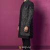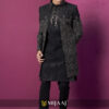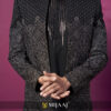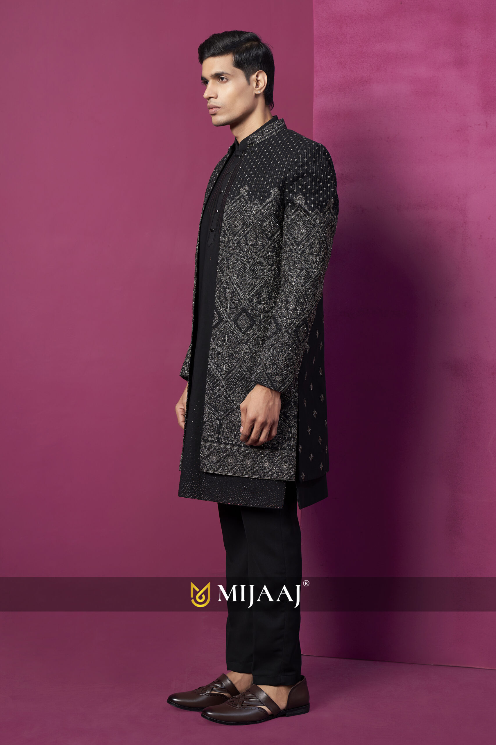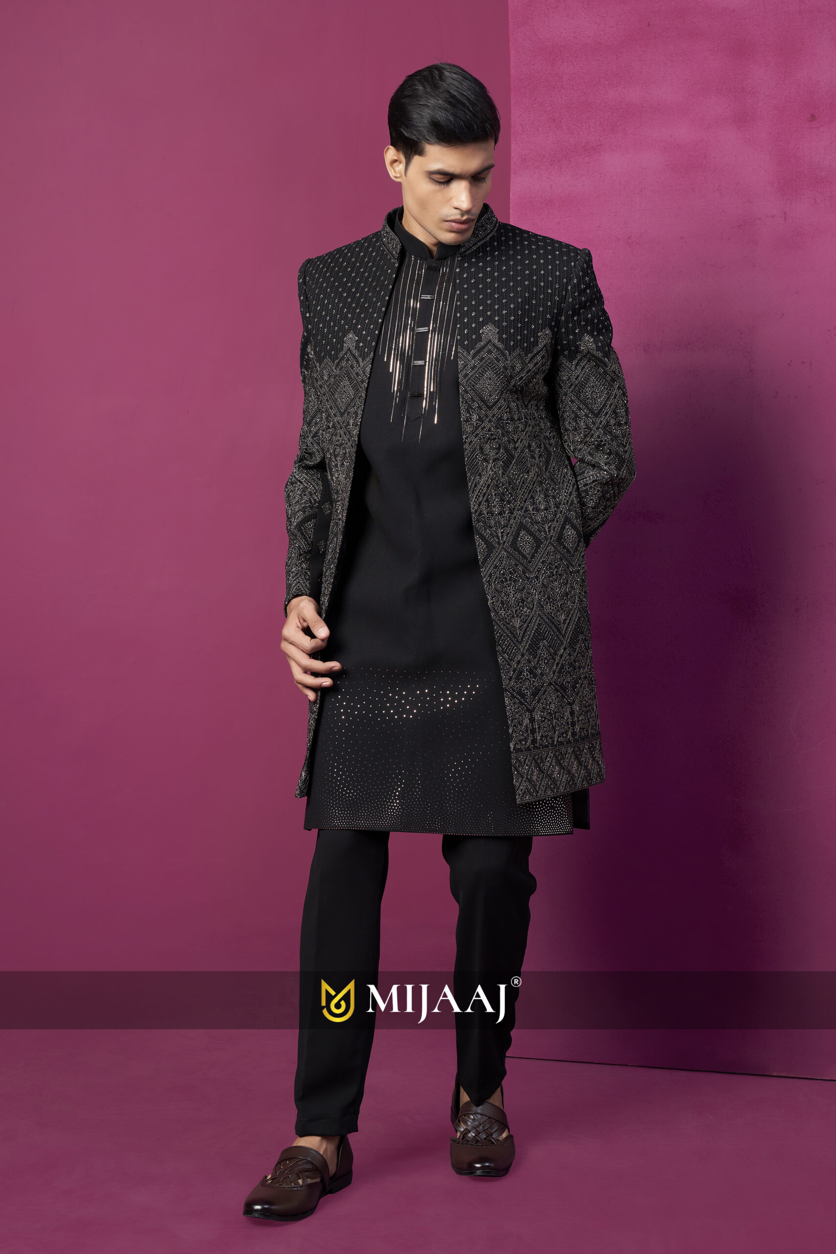 A striking black indo-western crafted for modern celebrations where elegance meets power. This ensemble features intricate geometric embroidery, subtle sequin highlights, and a structured royal silhouette. The layered kurta design adds depth, while the rich black palette creates a bold, timeless statement. Perfect for cocktail nights, sangeet ceremonies, and grand receptions where the spotlight belongs to you.