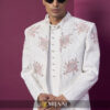 Crafted in a pearl-white palette, this floral-embroidered jacket set reflects understated royal finesse. Detailed threadwork and pastel florals elevate the overall aesthetic, while the long kurta and tailored trousers ensure a perfectly balanced modern groom look. Ideal for mehendi, sangeet, and contemporary wedding functions.