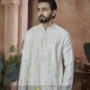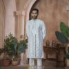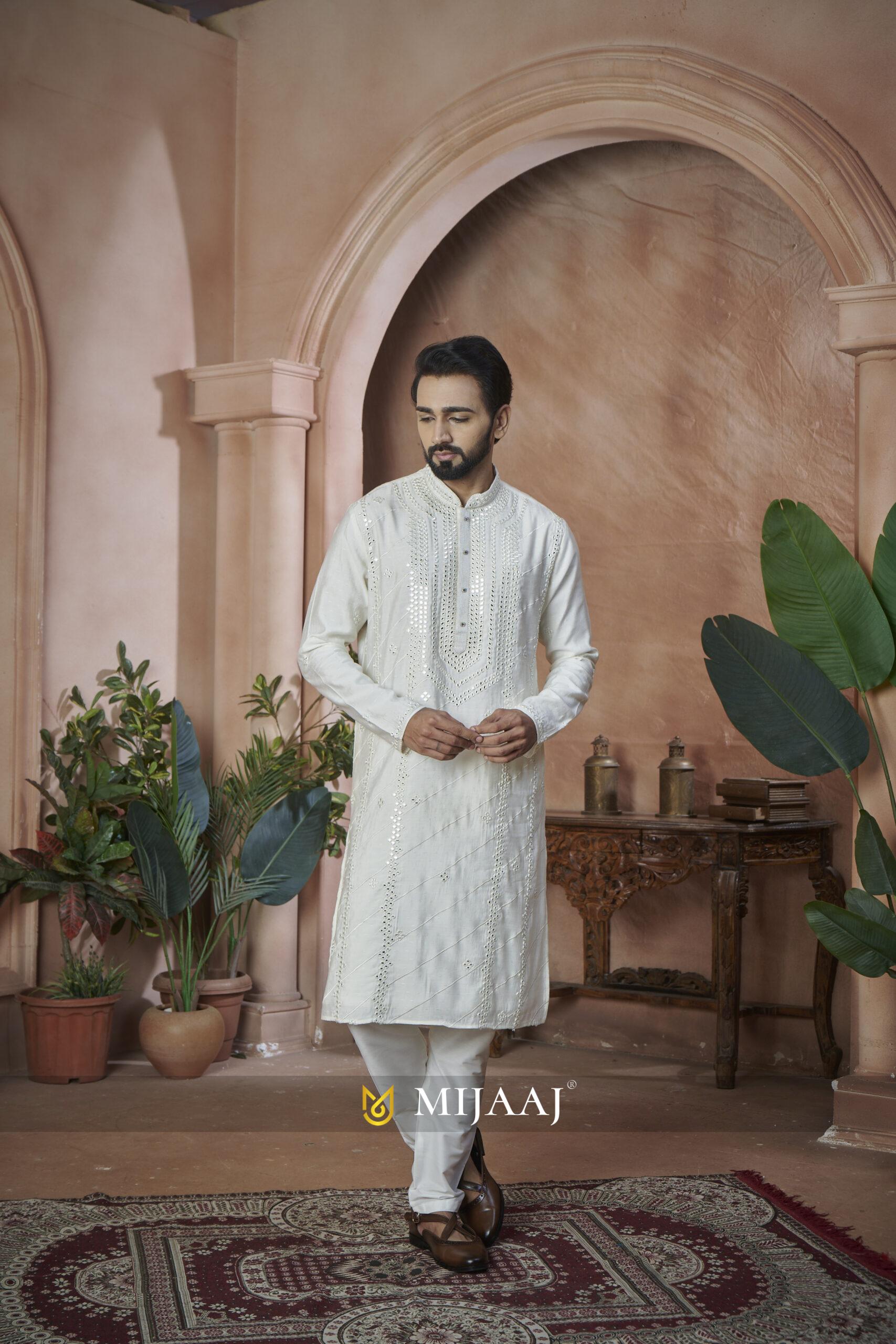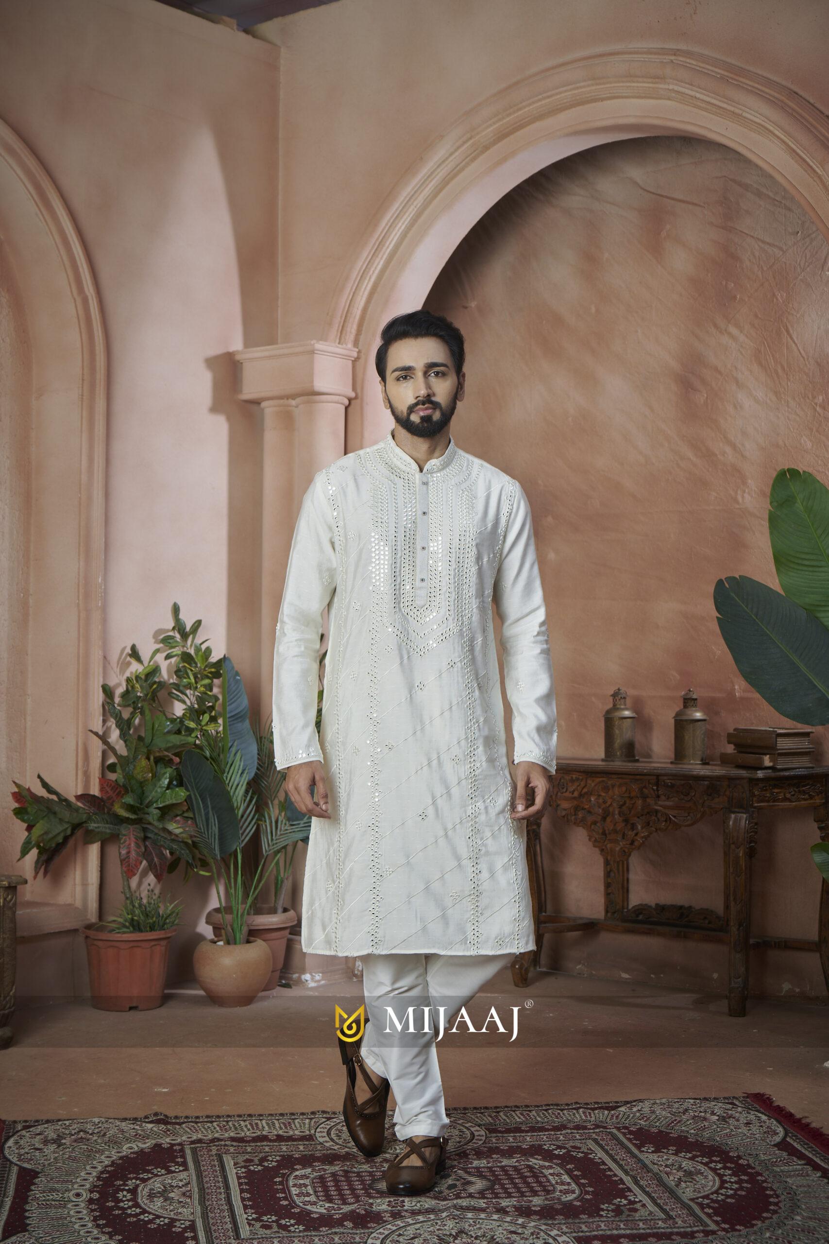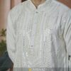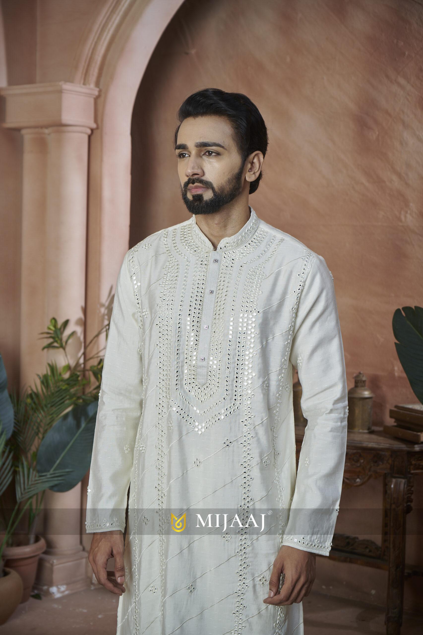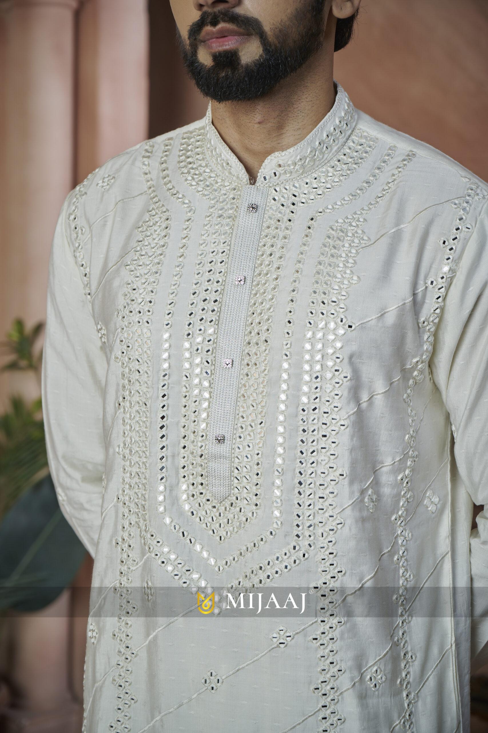 This cream kurta showcases exquisite mirror work, bringing a subtle shimmer to its graceful design. The light tone and refined craftsmanship make it an ideal pick for festive celebrations. A perfect blend of tradition and modern elegance for special occasions.