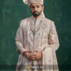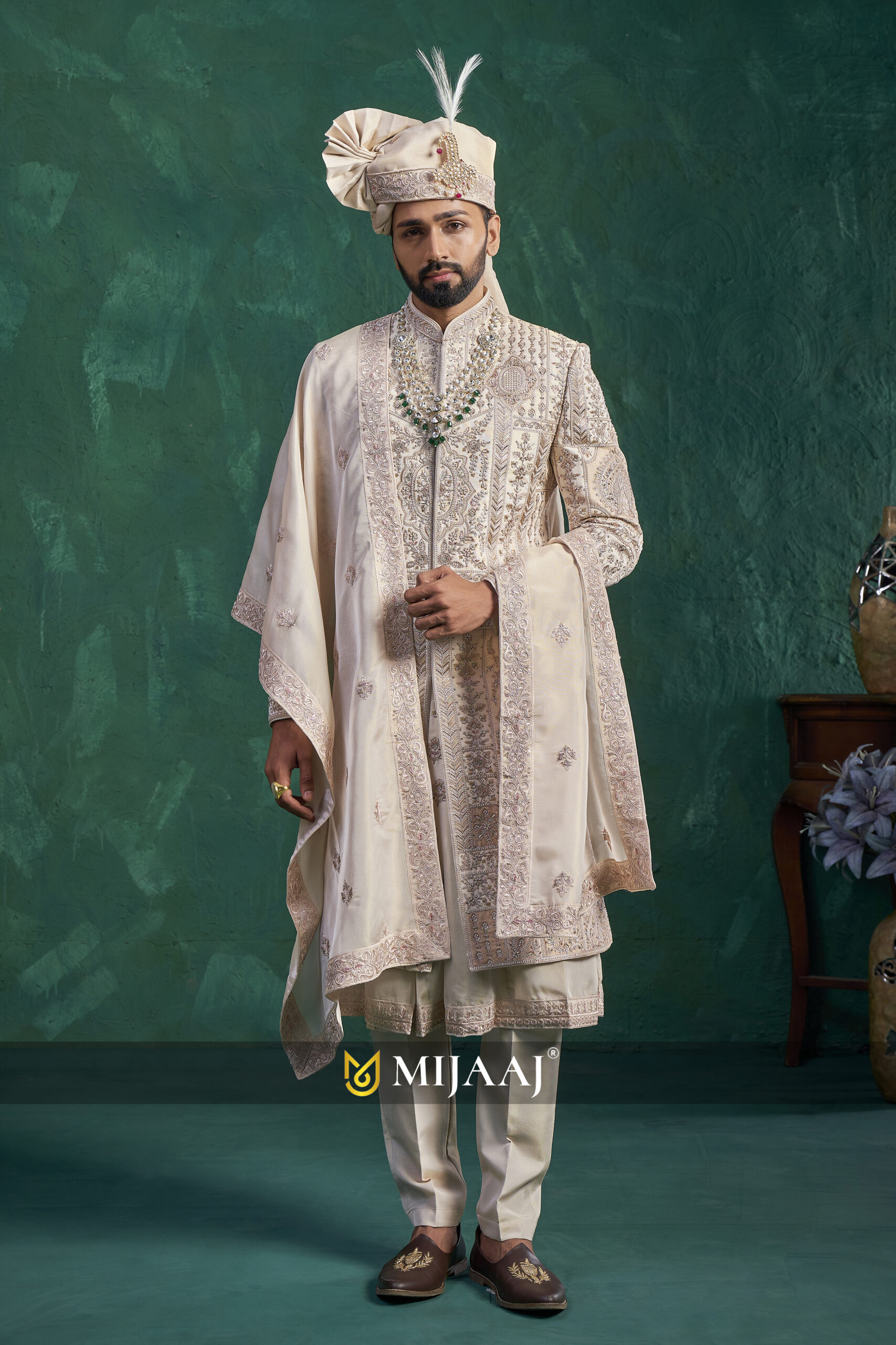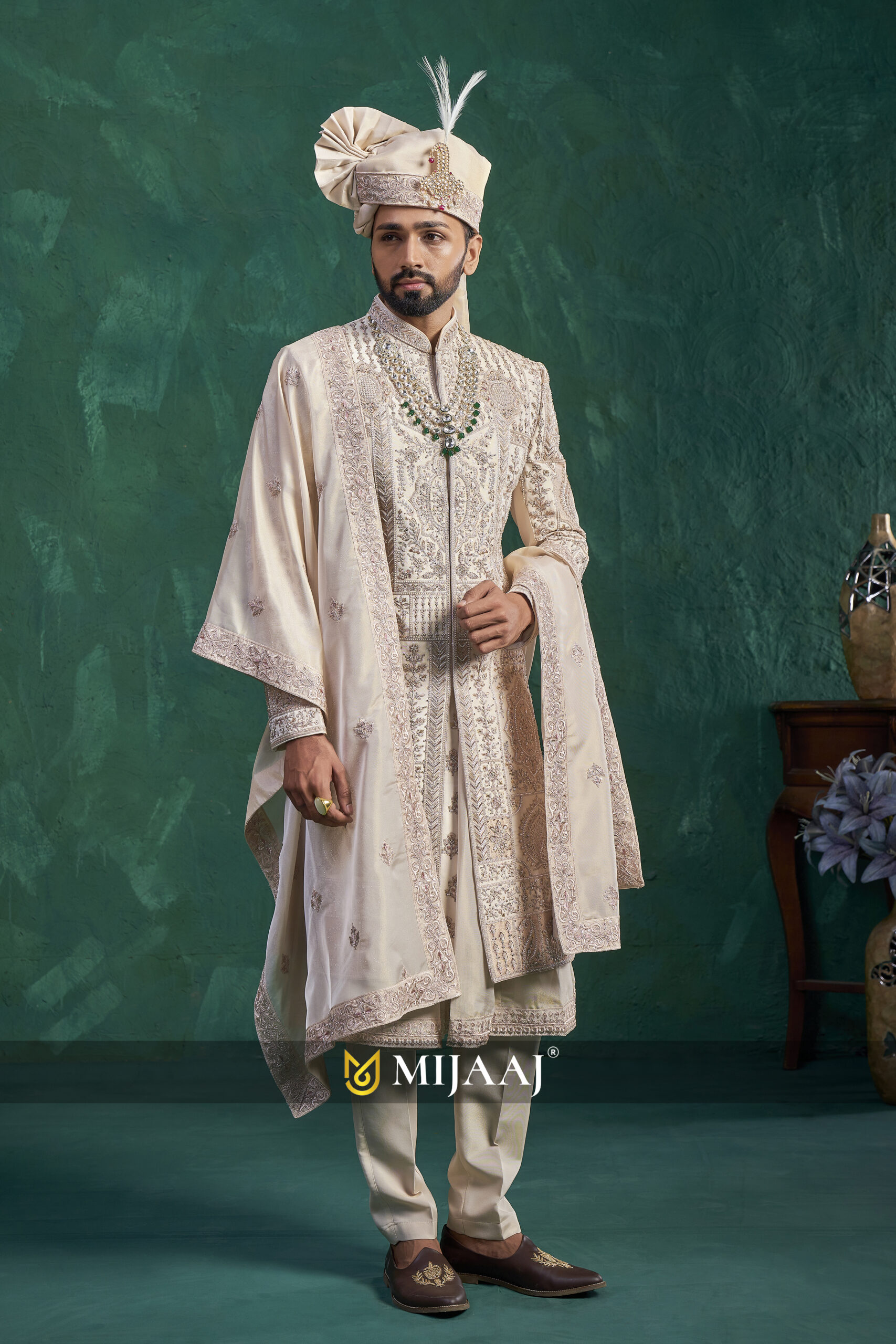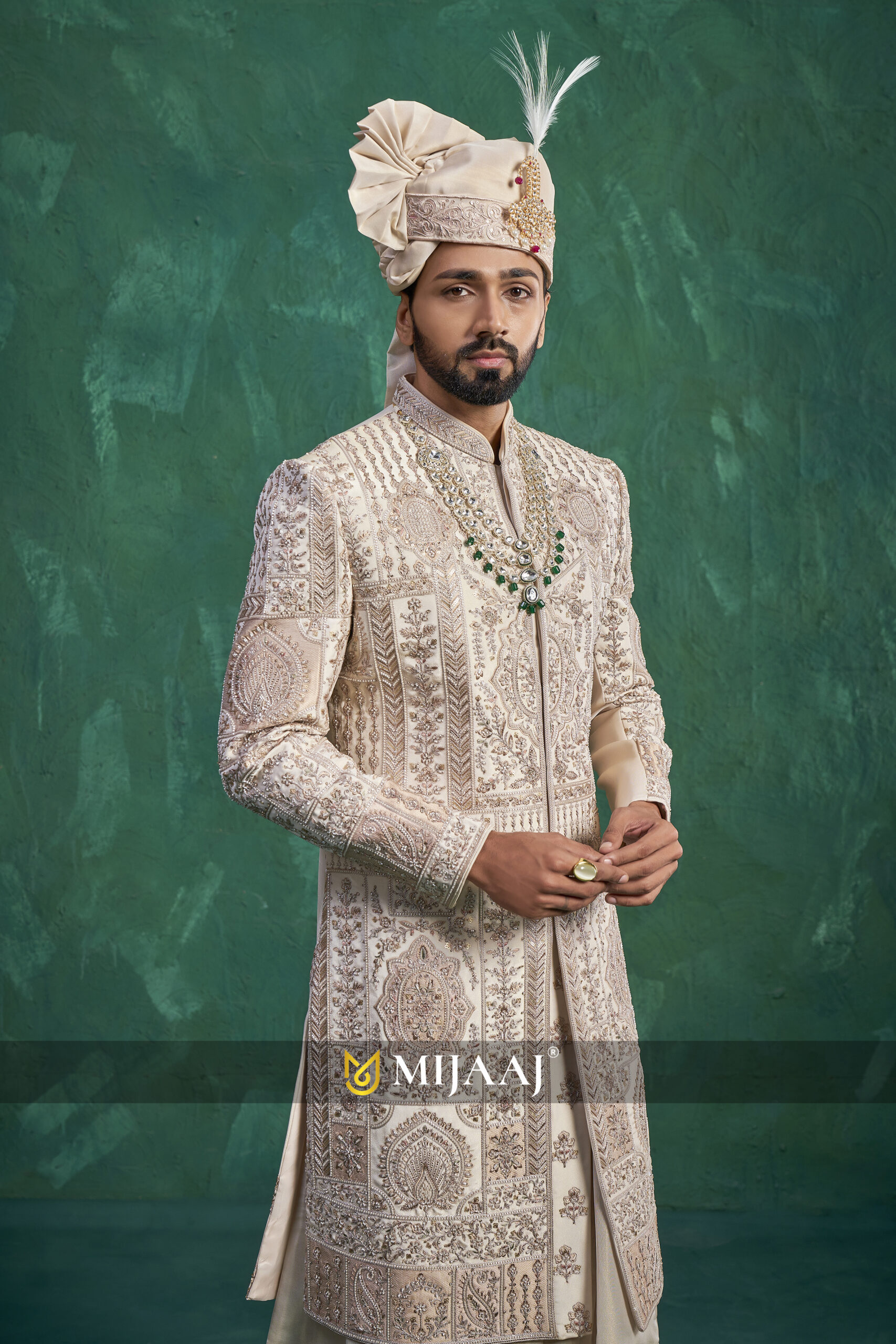 Gold Ivory Royal Motif Handcrafted Sherwani – Mijaaj