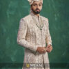 This sherwani showcases a refined blend of gold and ivory tones with intricate motif-based hand embroidery. The symmetrical patterns and premium finishing add depth and sophistication, making it a stunning choice for wedding celebrations.