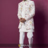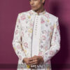 A refined ivory Indo-Western jacket adorned with delicate multicolor floral embroidery for a fresh, contemporary royal aesthetic. Crafted on a soft white base, this look blends tradition with modern elegance, making it ideal for engagement ceremonies, receptions, and festive celebrations. Paired best with crisp white kurta-pants for a sophisticated silhouette.