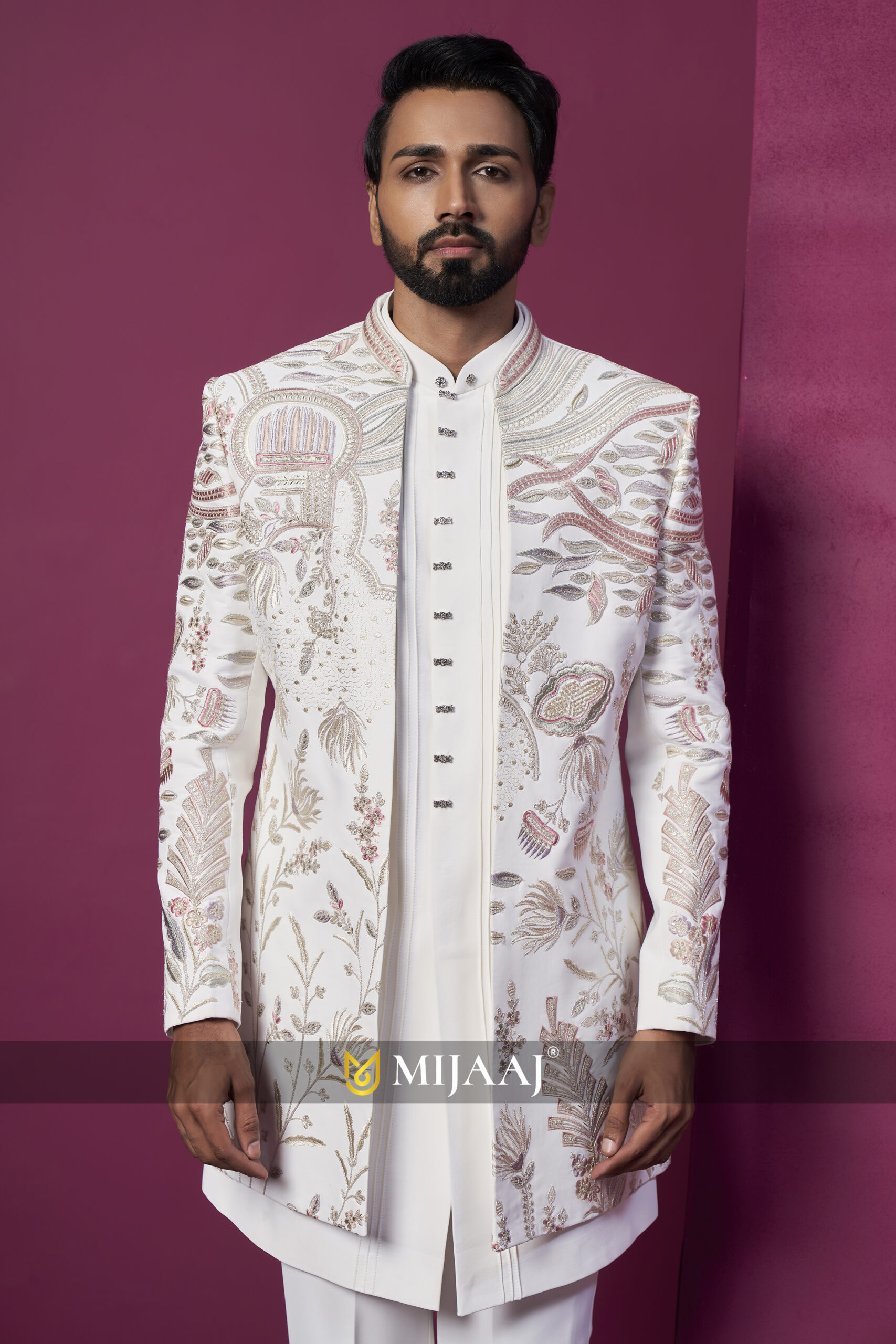 A refined ivory Indo-Western jacket adorned with delicate multicolor floral embroidery for a fresh, contemporary royal aesthetic. Crafted on a soft white base, this look blends tradition with modern elegance, making it ideal for engagement ceremonies, receptions, and festive celebrations. Paired best with crisp white kurta-pants for a sophisticated silhouette.