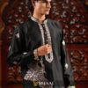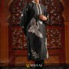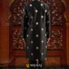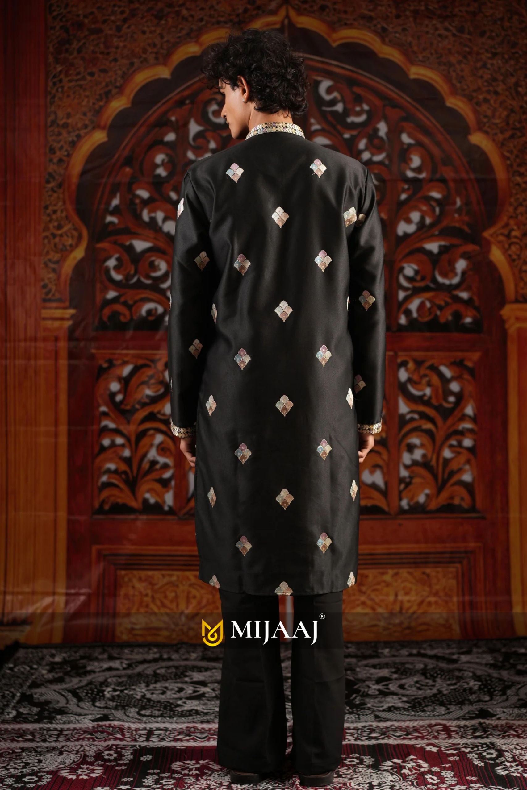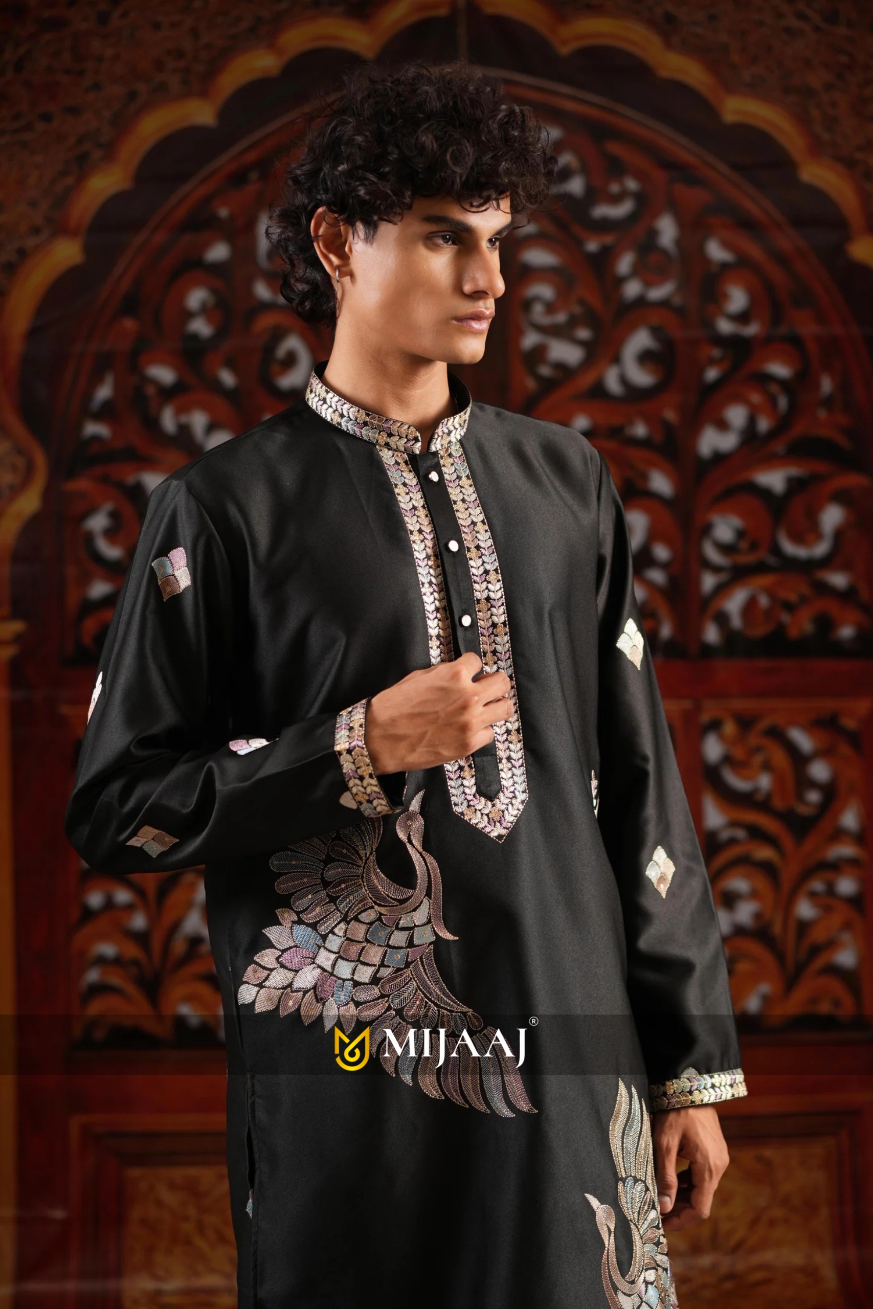 Men’s Black Satin Silk Kurta with Golden Zari & Multicolour Embroidery Set – Mijaaj
