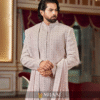 An extravagant sherwani adorned with dense zari embroidery, traditional motifs, and luxurious craftsmanship. The gold-on-ivory palette highlights its royal character, while the structured silhouette makes it an exceptional groom’s outfit for high-profile ceremonies.