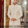 Crafted with fine threadwork and delicate bead embellishments, this sherwani blends traditional artistry with luxurious detailing. The pastel pearl-gold tones add a graceful sheen, creating an ensemble perfect for elegant wedding ceremonies and grand indoor functions.
