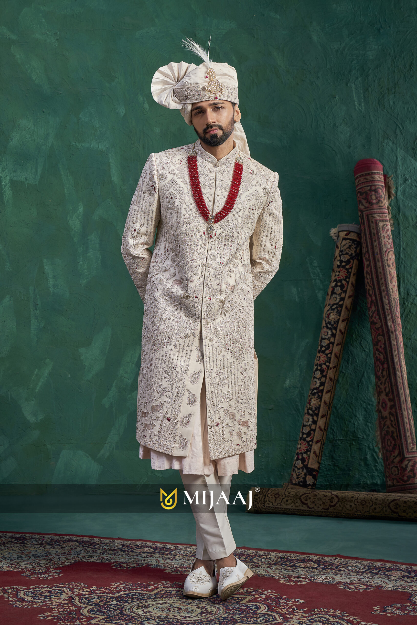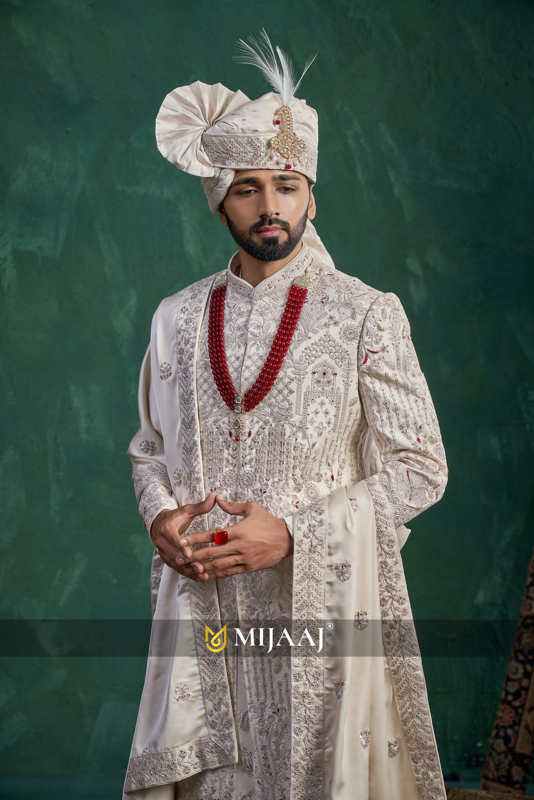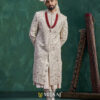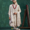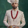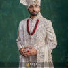 Featuring luxurious embroidery across the entire silhouette, this sherwani blends traditional artistry with modern finesse. The ceremonial red mala and premium draped stole enhance the royal appeal, making it an excellent choice for a statement wedding look.