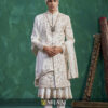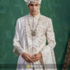 Featuring Mughal-inspired floral and architectural motifs, this sherwani highlights fine embroidery and a refined ivory tone. The harmonious blend of motifs and craftsmanship delivers an elegant, heritage-rich look ideal for day weddings and cultural ceremonies.
