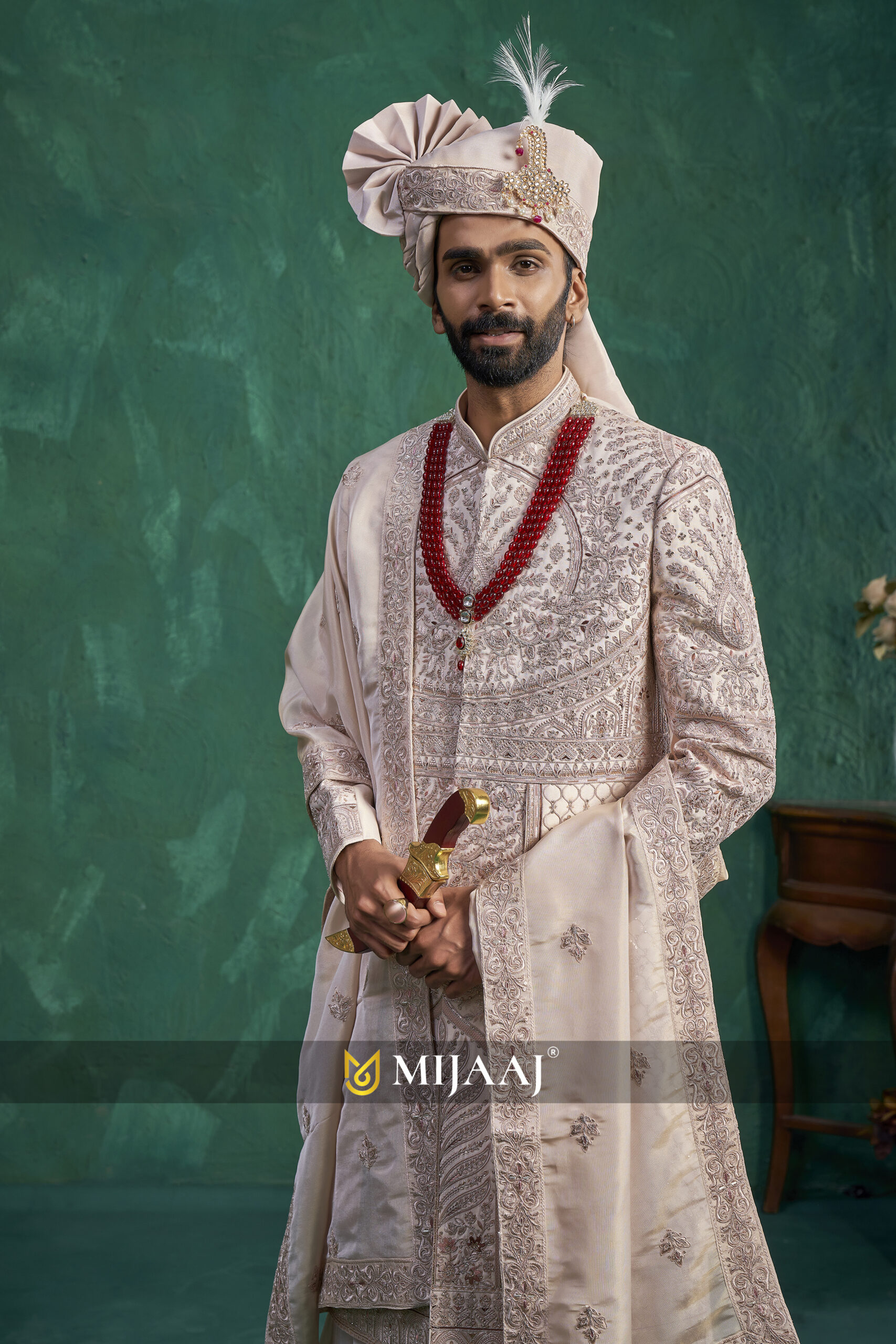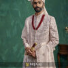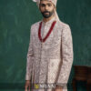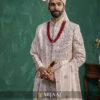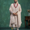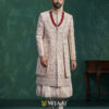 A luxurious champagne-toned sherwani adorned with intricate embellishments and fine threadwork. The elegant stole, paired with traditional layering, adds richness and grandeur. Perfect for grooms who want a royal and sophisticated wedding ensemble.